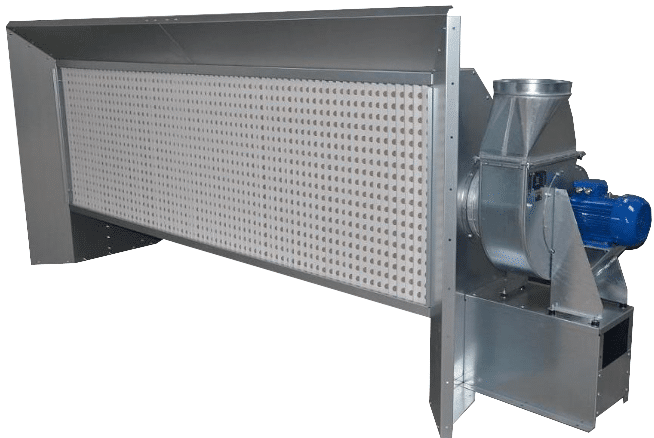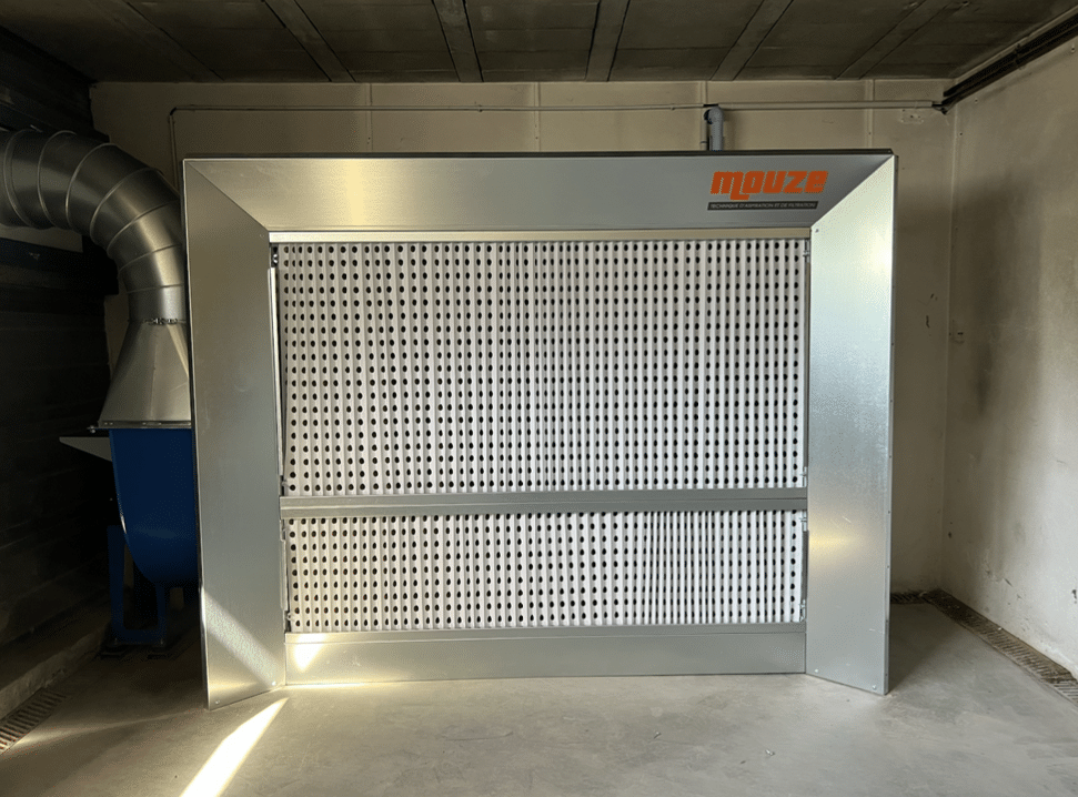 La filtration est effectuée par un filtre en carton perforé plissé. Les perforations réparties de façon dissymétrique créent ainsi un passage tortueux qui oblige le courant d’air à se heurter à quatre surfaces au moins avant de sortir du filtre. De cette façon, les particules de peinture en suspension adhèrent et se déposent à la surface du carton. Une deuxième filtration est effectuée à travers un filtre en fibre de verre. Une troisième filtration par filtre synthétique est possible. Seul l’air épuré traverse le filtre.
